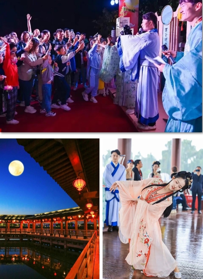 诗经里景区的“长安诗会”充满文化气息,琇莹香街上,唐诗纱幔随风轻拂;小雅书舍内,诗词爱好者们以诗会友。“赢票潮人局”活动中,游客参与NPC互动不仅能赢“银票”,还能欣赏到精彩的才艺表演。“国潮战音秀”将经典唐诗改编成潮流音乐;“全民潮玩”国风夜打破听觉界限,演绎国风新韵。