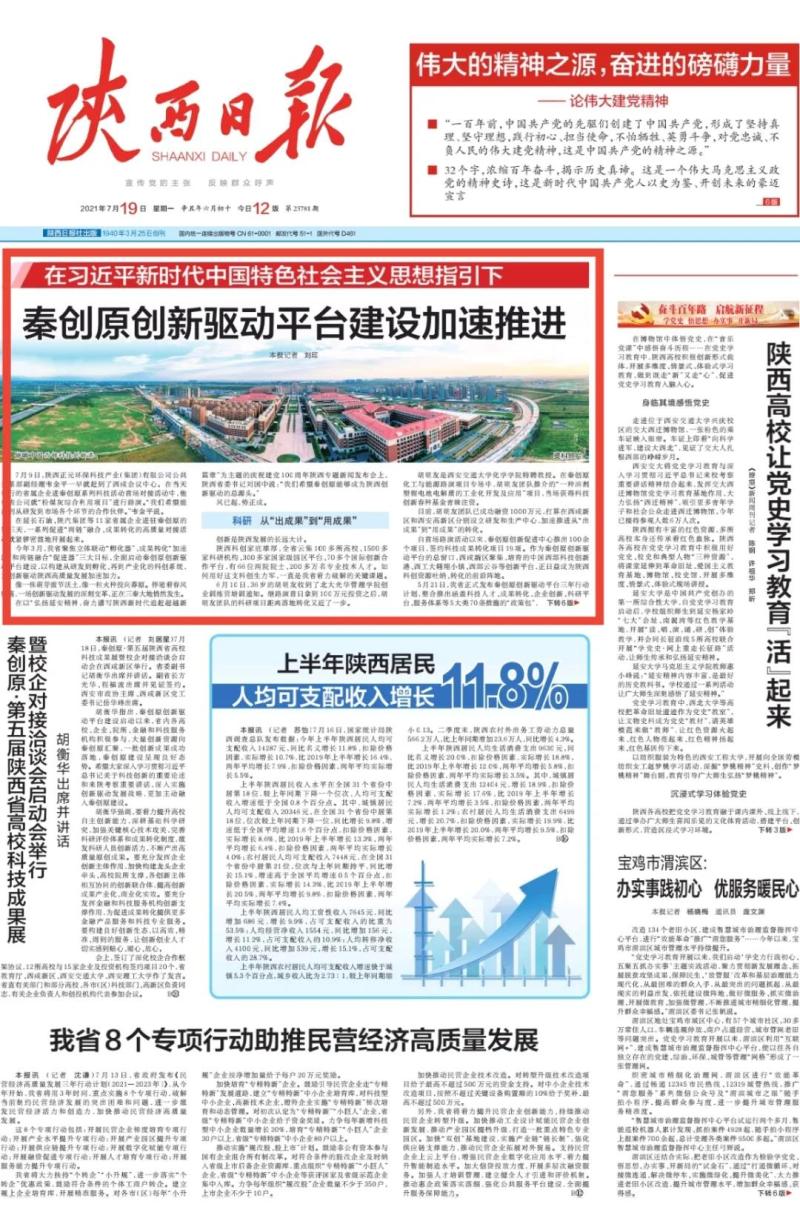 今天陕西日报头版头条刊发《秦创原创新驱动平台建设加速推进》聚焦我省全面启动秦创原创新驱动平台建设,为创新驱动陕西高质量发展加速加力。