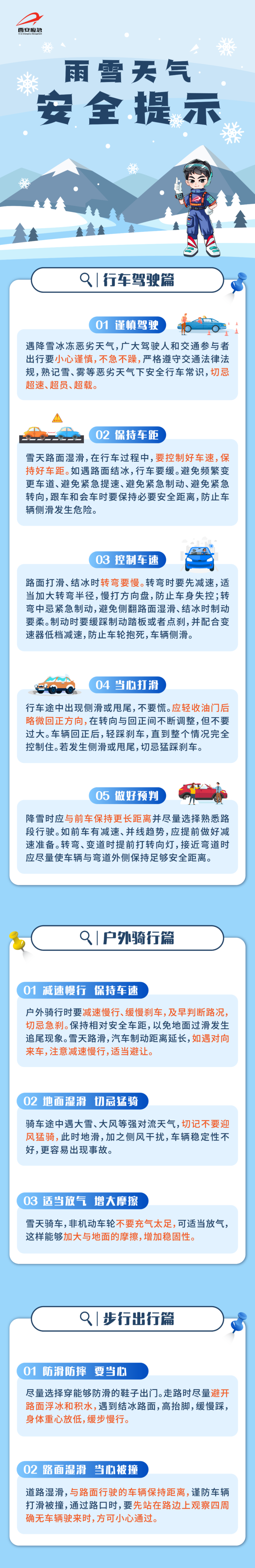 行人注意防寒防滑,驾驶人员小心驾驶,车辆应当采取防滑措施。