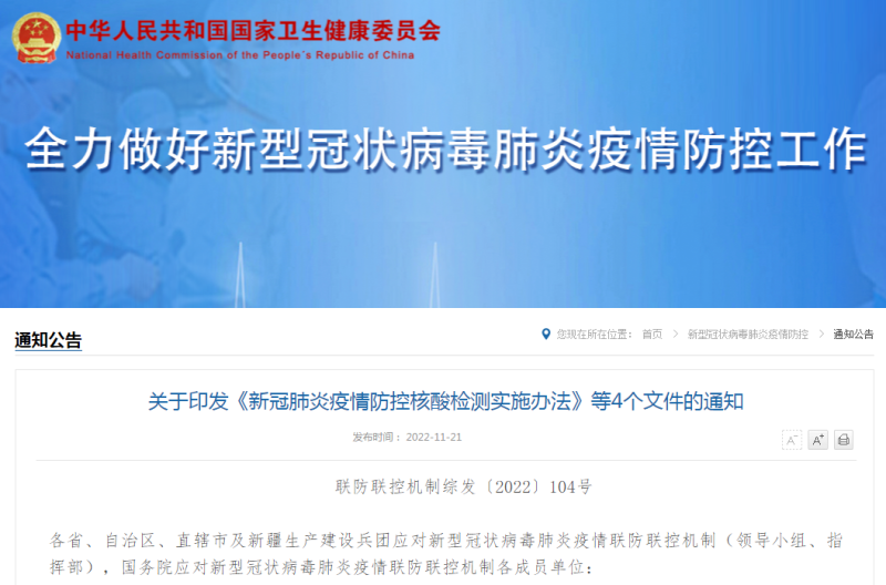 为进一步指导各地各部门做好新冠肺炎疫情防控工作,根据《新型冠状病毒肺炎防控方案(第九版)》《关于进一步优化新冠肺炎疫情防控措施科学精准做好防控工作的通知》有关要求,国务院联防联控机制综合组制定了《新冠肺炎疫情防控核酸检测实施办法》《新冠肺炎疫情风险区划定及管控方案》《新冠肺炎疫情居家隔离医学观察指南》《新冠肺炎疫情居家健康监测指南》。现印发给你们,请认真组织实施。各地各部门在执行过程中如有相关建议,请及时反馈国务院联防联控机制综合组。
