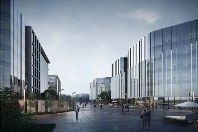 作为办公区域的南区,则以“天”为概念,采用圆弧、曲线作为建筑设计元素,追求“活泼、自由、开放”的设计理念,5栋单体延续北区南北中轴线为对称轴,北部布置2栋单体,南部布置3栋单体。目前,5栋办公楼正处于基础施工阶段。