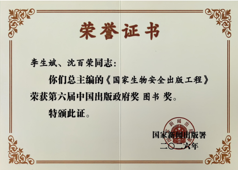 中国出版政府奖图书奖每三年评选一次的中国出版政府奖,是国内新闻出版行业的最高奖项,本届共评选出60种获奖图书,均为各领域兼具思想高度、学术深度与传播价值的标杆作品。作为我国生物安全领域的里程碑式出版成果,《国家生物安全出版工程》已先后获评第二届“陕版好书奖”、中国出版协会2024年度百种优秀科技图书,本次摘得中国出版政府奖,是对其学术价值与社会意义的国家级肯定。
