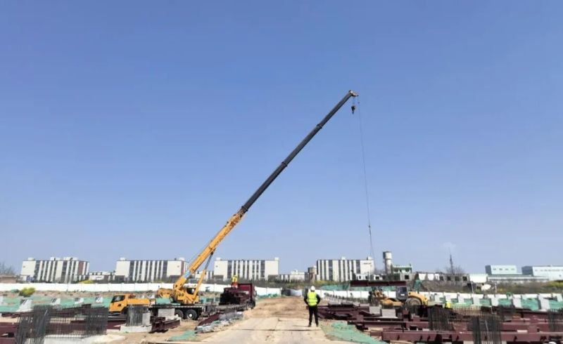 项目南侧办公区,施工人员正在进行钢结构吊装、校正、焊接等作业。据工作人员介绍,钢结构安装工序主要包括吊装、校正、焊接、再校正,“难点在于校正难度大、焊接量大,需要反复校正才能保证精度。”项目北侧作为生产区,目前,桩基浇筑已全部完成,正在进行地面平整和土方回填。按照施工计划,项目钢结构安装将持续约3个月,预计6月底整个项目的主体结构全面封顶。