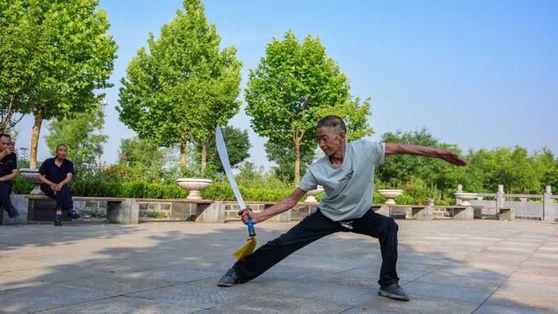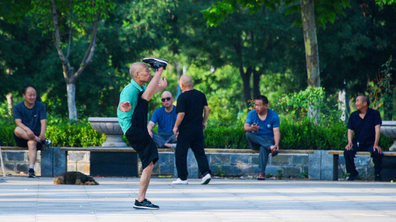 转头来到公园的另一边,王大爷正在踢腿练功。他身形精瘦,轻轻松松就能把腿尖踢过头顶,坐在树荫下休息的“观众团”露出赞许的目光。待他练罢,旁边的大爷也纷纷亮出绝活:程大爷的拳法行云流水,聂大爷的拳法刚劲有力,汤大爷的刀法凌厉迅猛……看得人眼花缭乱。