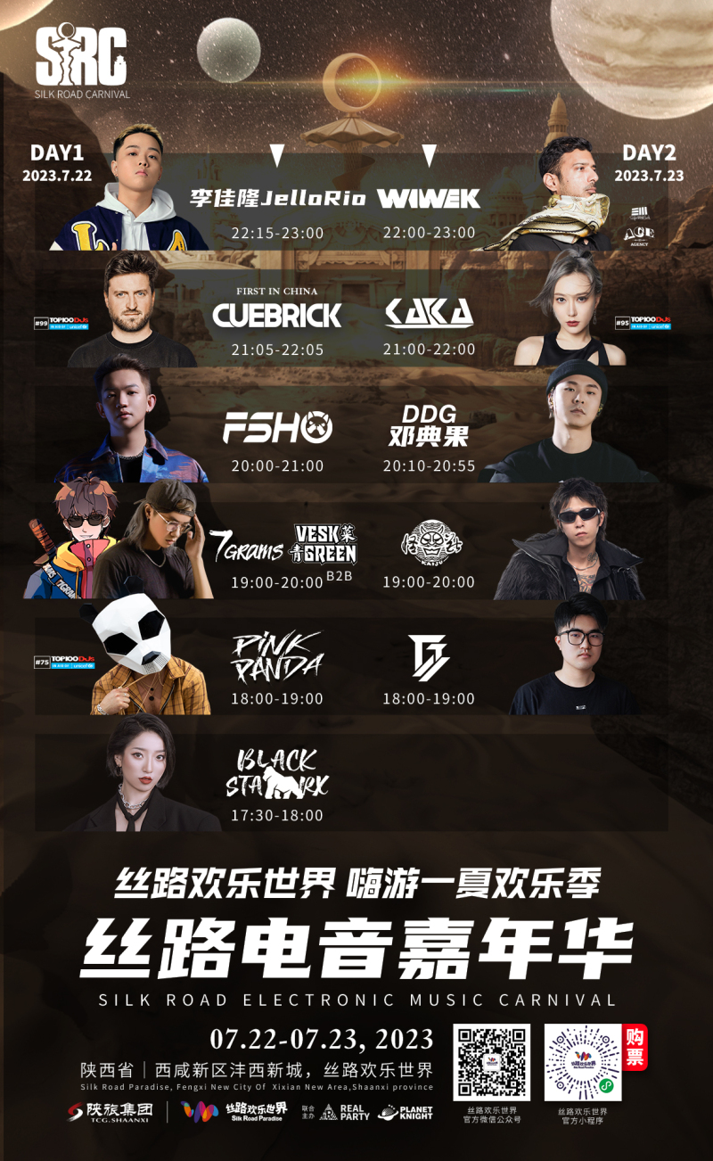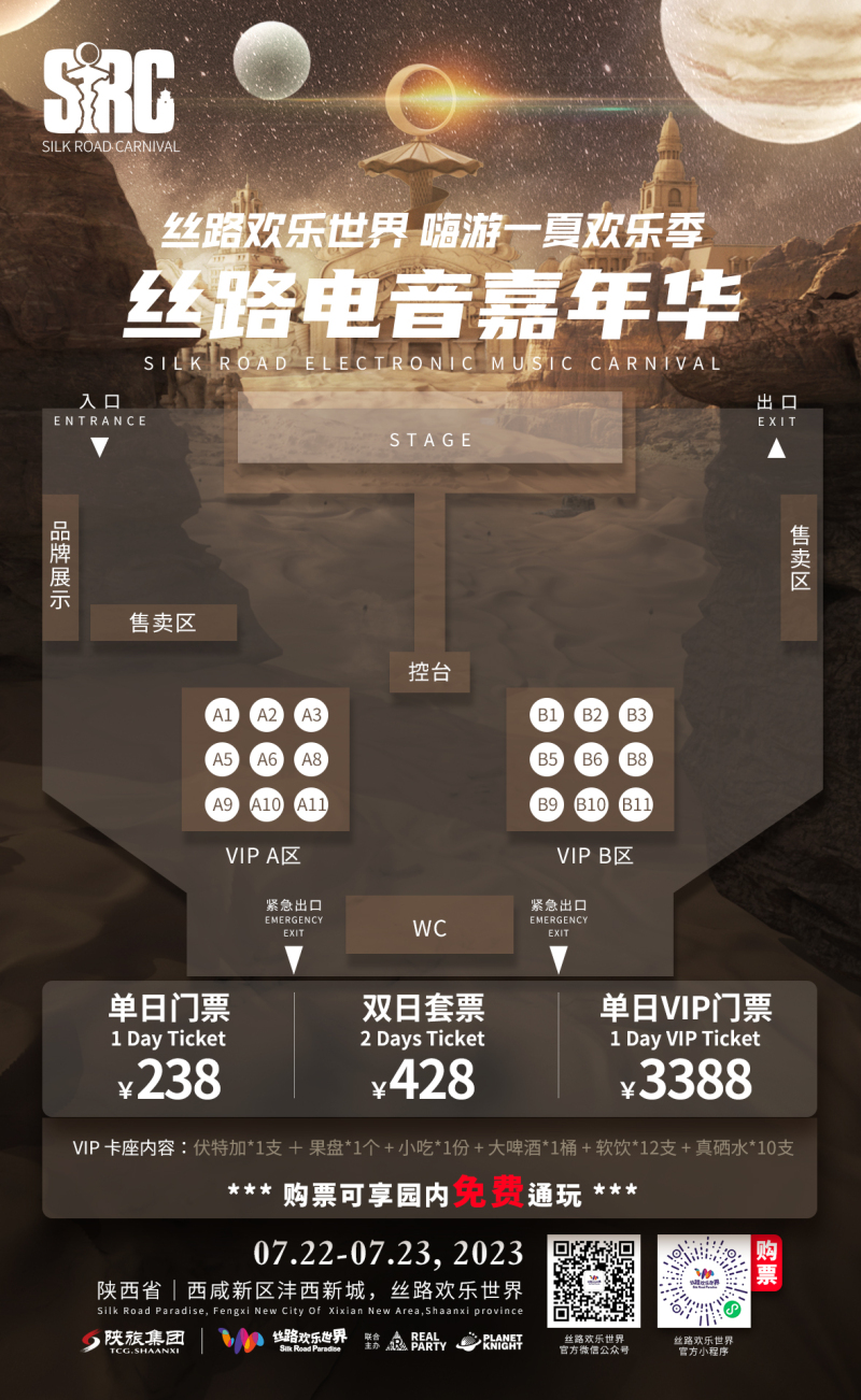 此次西安·SRC丝路电音嘉年华位于丝路欢乐世界南广场,由于南门施工关闭,请游客从北门和西门入园,从北门进去园区的Raver走过穿越“沙海秘境”,即可达到嘉年华会场。