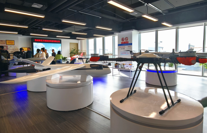 走进位于能源金贸区的西咸新区天枢航空科技有限公司产品展厅,无人机阵列引人注目:从便携小型机到几米长的中大型机,这些“多面手”可用于植保、环境监测、低空物流等领域。
